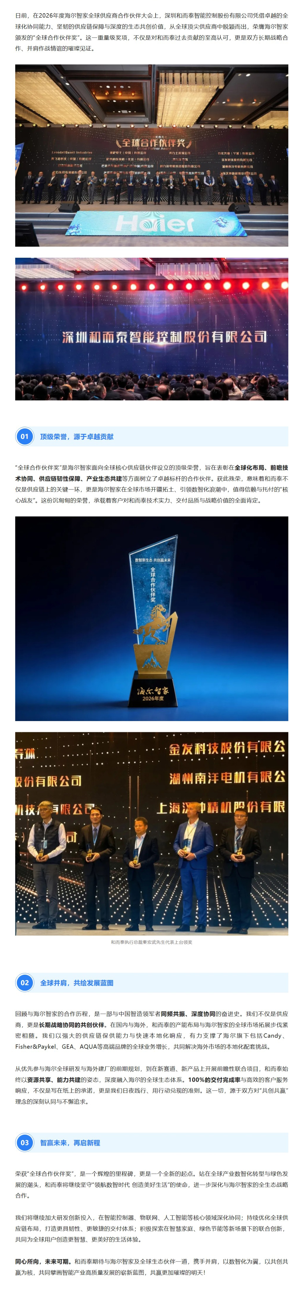 同心致远,共膺殊荣!和而泰斩获海尔智家顶级荣誉“全球合作伙伴奖”